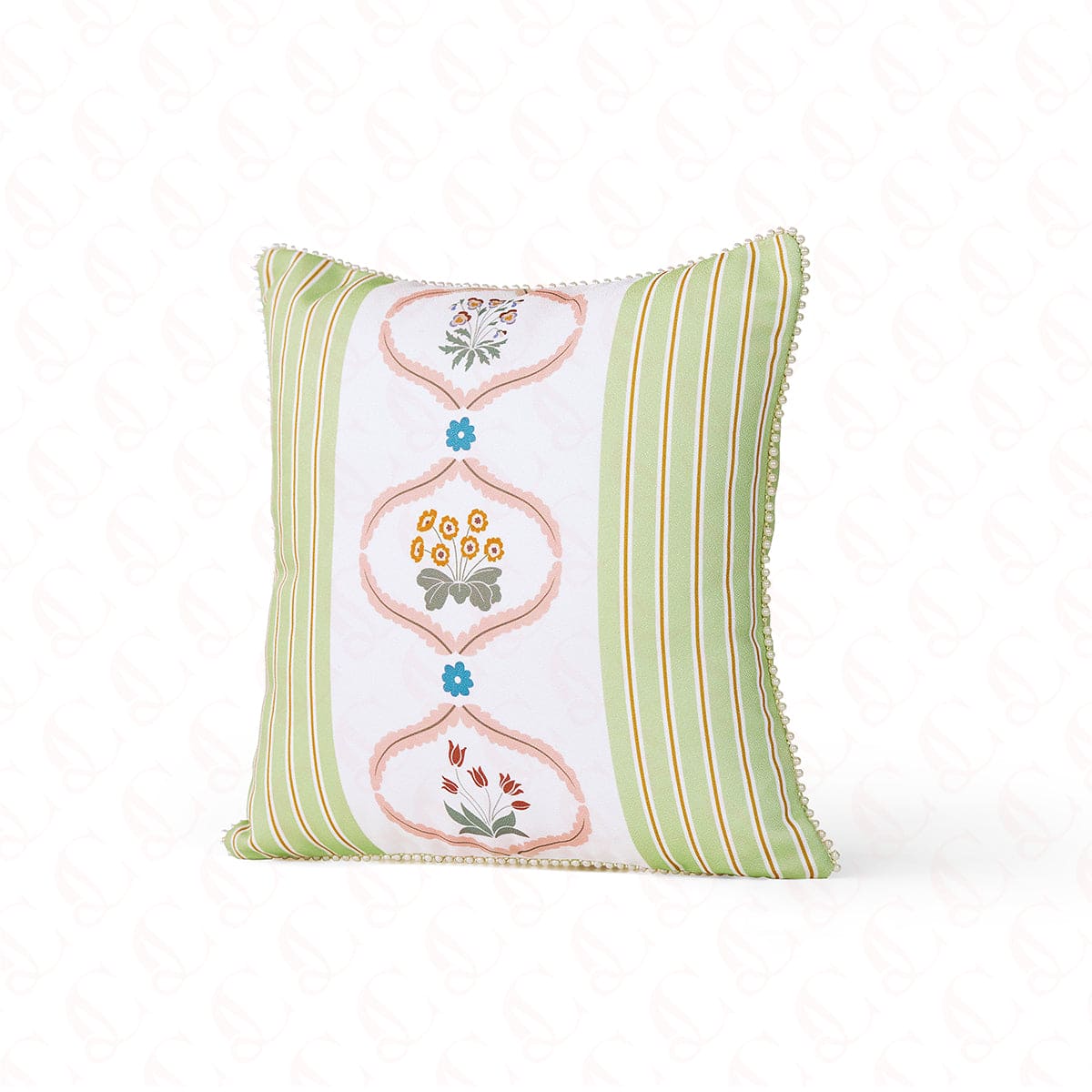 The cover's sides are decorated with multi-coloured vertical striped lines that accentuate the floral centrepiece's appeal. These stripes give the design a dynamic flair while also adding depth and visual appeal. With its exquisite pearl piping, this cushion cover adds an extra touch of elegance to its overall design, while remaining subtle and luxurious.