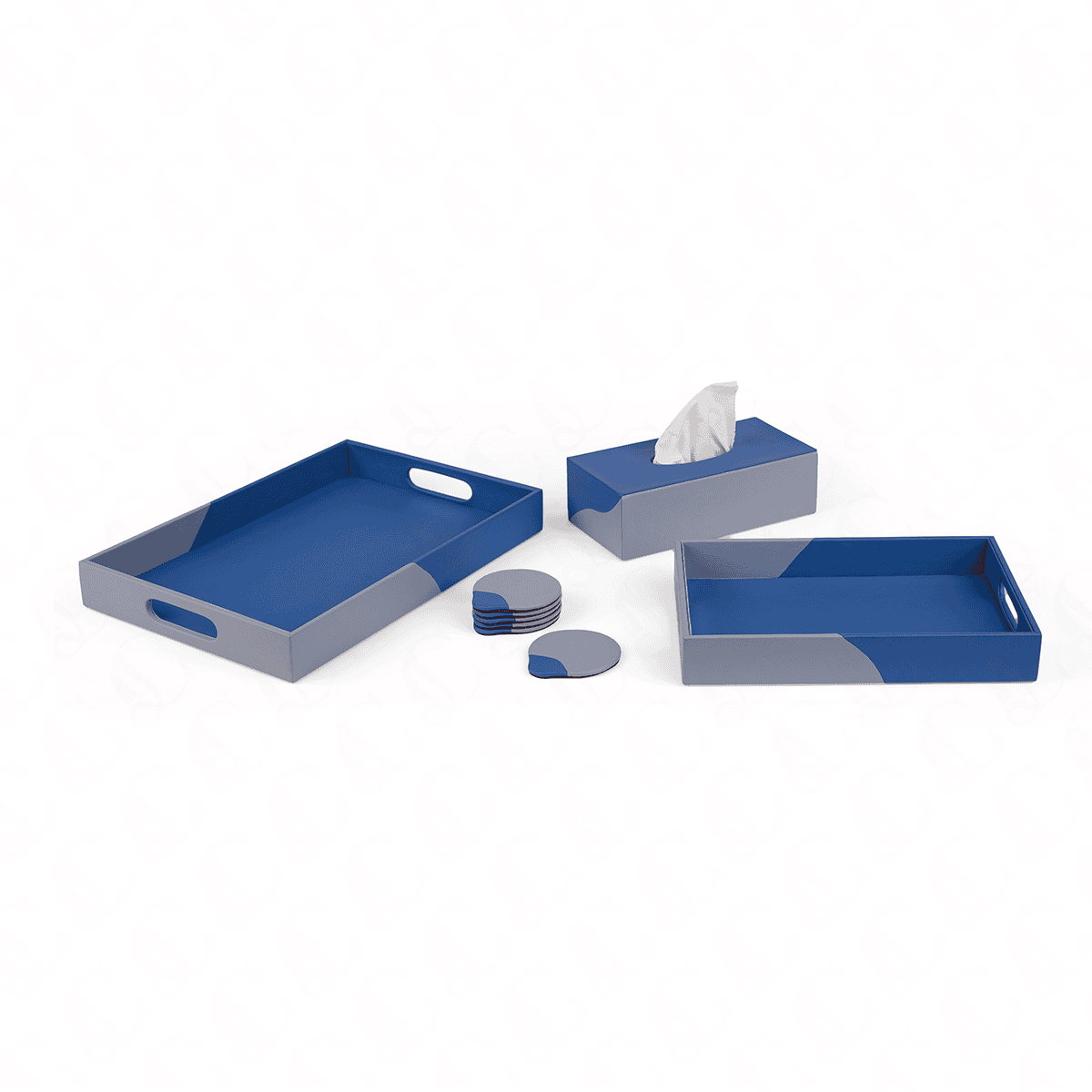 Introduce a modern touch to your decor with this sleek faux leather set, featuring a tissue box, trays, and coasters in a stylish dual-tone design. Perfect for adding both practicality and sophistication to any setting.
