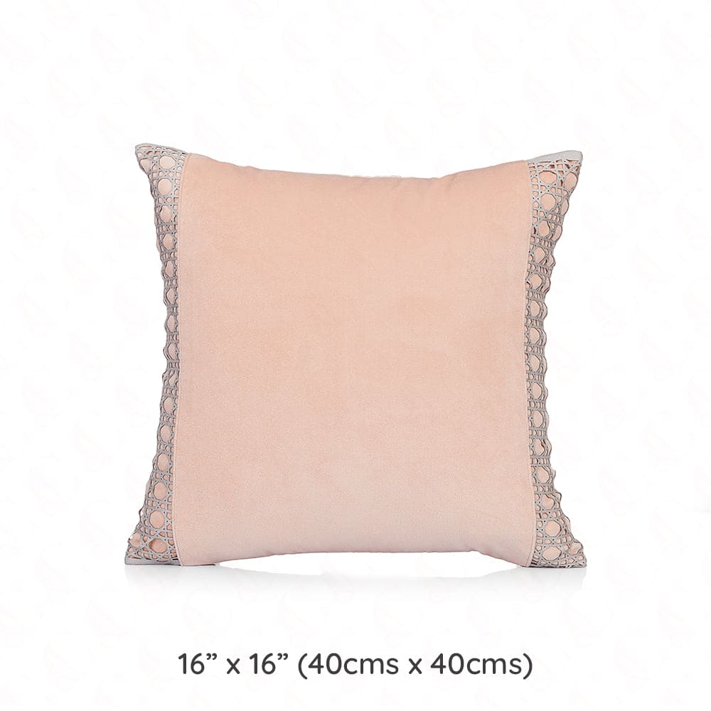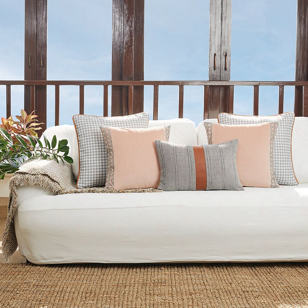 Step into the enchanting world of our Bonnie Blush Collection—a set of five nostalgic cushion covers that unveil a narrative of timeless design, where each piece resonates as a singular character in a symphony of contemporary elegance. Embark on a journey through the Scottish Lowlands with the Houndstooth duo, weaving together the threads of history and modernity in a dance of sophistication. The Blush Rattan pair introduces a soft burst of colour and whimsy, featuring blush pink velvet adorned with laser-cut faux leather rattan patterns inspired by Japanese Tatami mats, infusing your space with a playful and fresh vibe. The Linara cushion cover, standing as a solitary piece, whispers stories of strength and unity through its high-quality linen canvas and intricate chevron pattern. The soothing grey-beige hues and tan-coloured leather band bring an air of serenity and refinement. These cushions, each a storyteller in its own right, harmonize to create a captivating narrative—an invitation for you to tell your own tale through the harmonious interplay of tradition and modernity in your living sanctuary.