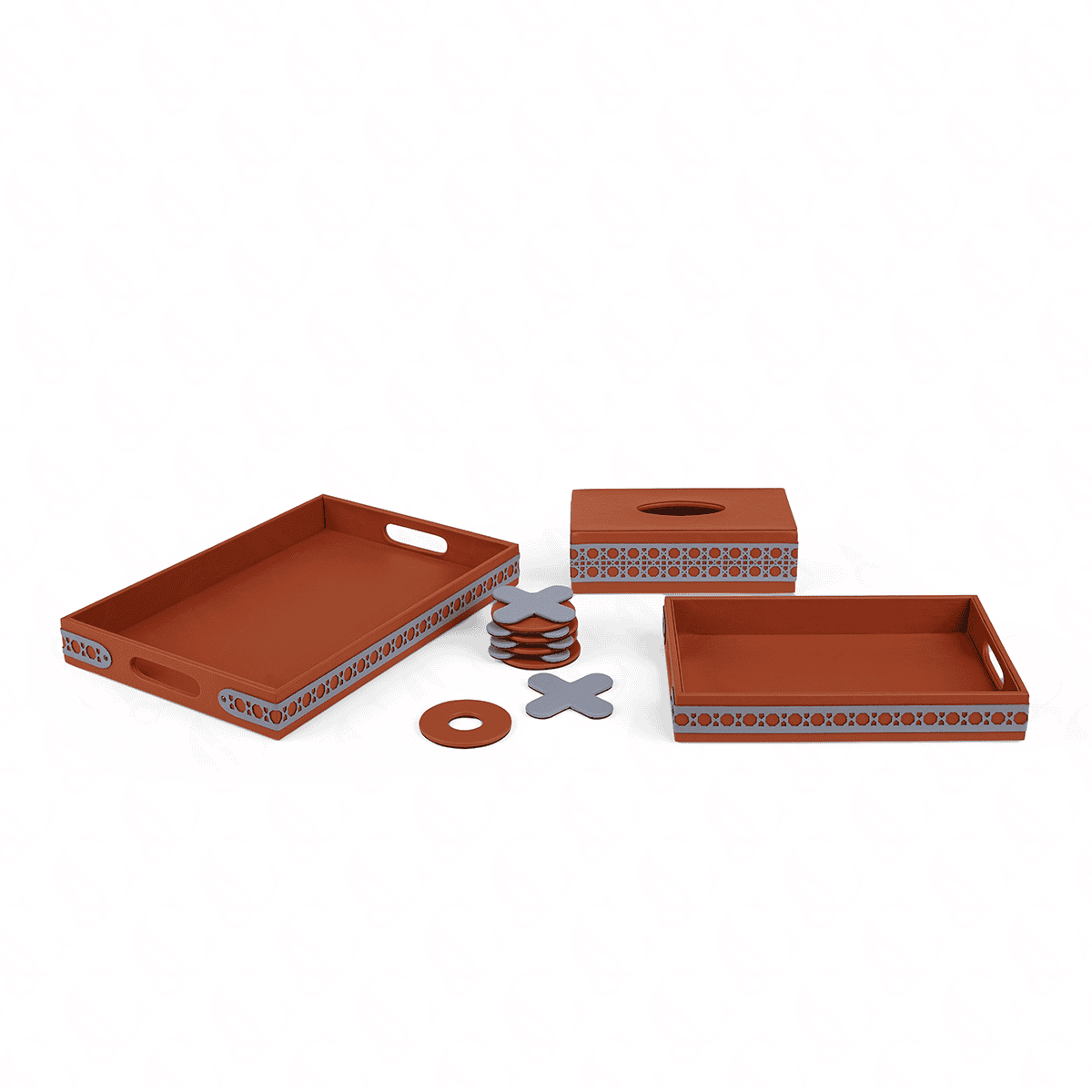 Elevate your home decor with this exquisite set of faux leather artifacts, featuring a tissue box, trays, and coasters. Designed with intricate patterns and rich earth tones, this set brings a touch of elegance and functionality to any space.