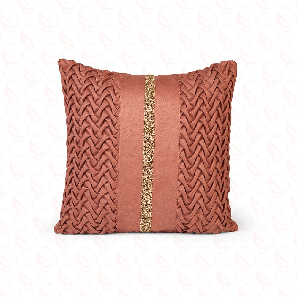 The foundation of this masterpiece lies in the lavish suede fabric, thoughtfully selected for its unparalleled richness and velveteen texture. As your fingertips caress its surface, you will revel in the sensuous touch that grants a feeling of indulgence and luxuriousness, creating a delightful tactile experience. The front of the cushion cover boasts a stunning display of fabric manipulation, an artful technique that adds depth and intricacy to the design. Imbued with a fastidious eye for detail, this intricate manipulation craftsmanship emerges from two sides, creating a visually captivating interplay of light and shadows. Each fold and twist has been painstakingly sculpted, giving rise to a dynamic aesthetic that catches the eye from every angle. At the heart of this design, a regal vertical band in a resplendent golden hue takes center stage, commanding attention and exuding an air of grandeur. Adorned with exquisite beadwork that weaves a tapestry of intricate patterns, this ornate band tells a story of artisanal mastery and timeless allure. The delicate gleam of the beads enhances the overall opulence of the cushion cover, infusing your living space with an aura of refined elegance.