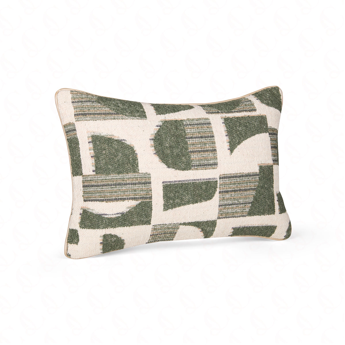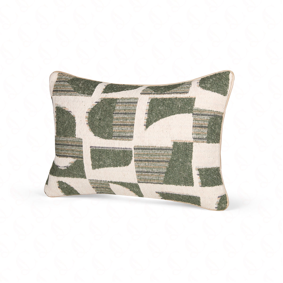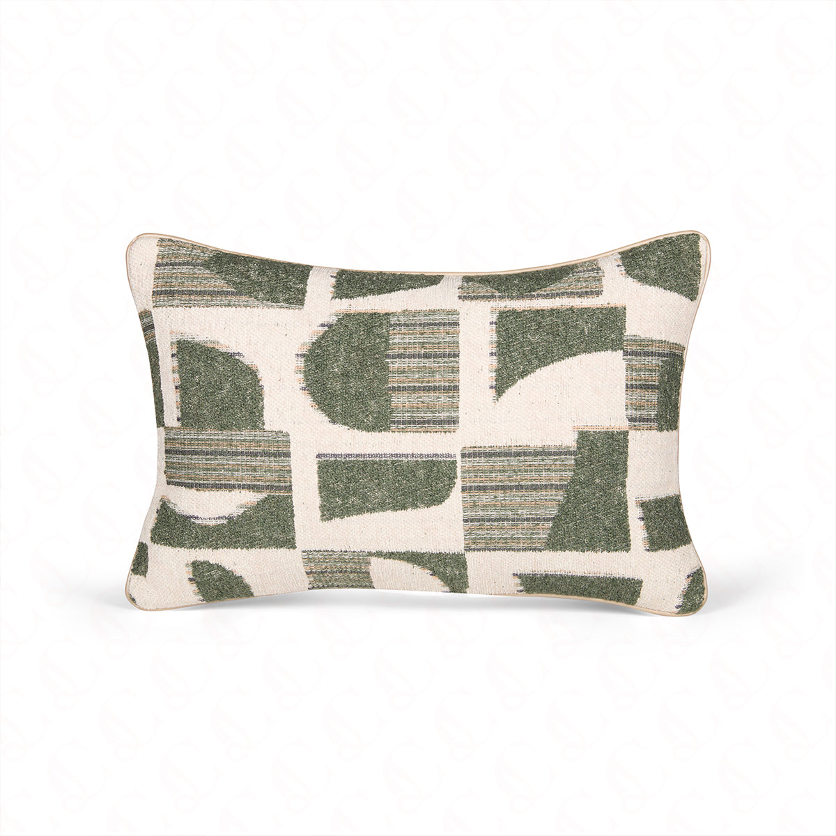 A canvas of modern artistry, this woven boucle cushion cover blends earthy greens with off-white in a geometric symphony. The textured patches, like abstract brushstrokes, evoke a sense of grounded sophistication, while the linen piping adds a soft yet structured edge. Perfect for spaces that crave a connection to nature with a contemporary twist, this piece whispers understated elegance and artistic charm.