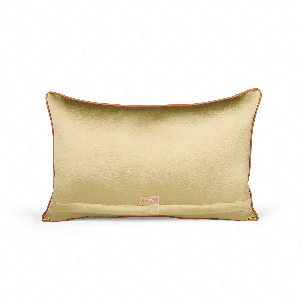 There’s something regal yet grounded about this cushion cover. The front blooms with swirling embroidered paisley motifs in earthy greens and browns, rich yet grounded. Faux ochre tan leather piping outlines it with a subtle strength, while the satin back slips in as a smooth contrast - quiet, sleek, and contemporary.